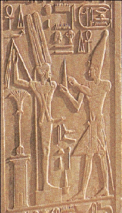 The pyramids served many purposes. One purpose was that of initiation and ceremonial rites, both for humans and for the magickal workings of the Gods. Many hieroglyphics depict the Gods tuning their chakras with a rod-like instrument. Satan gave these energy centers to humanity; they are known as the breath of life, breathed into us by God [Father Satan]. There are seven primary chakras and many minor ones. The hook and the flail were tuning tools for the primary chakras along the spine. A mural on a wall at Abu Simbel depicts Horus holding a rod to the back of Osiris' head, at the point that is the primary doorway to the eighth chakra [above the crown of the head]. The hook is moved up and down the rod to tune the chakra. Osiris is standing with an erection. Sexual energy is a paramount component in the rite of resurrection and immortality. Kundalini is sexual; the life force. Sexual energy is that of the life force, as it has the power to create life through another human being. The sexual energy runs up and down the spine during the tuning process. The Egyptian Ankh symbolizes eternal life, and eternal life is linked to the breath. The Ankh is also linked to sexual energy.