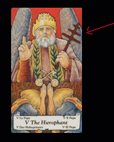 "AUM", please click here. The symbol of the chakra trinity—the hip chakras, shoulder chakras, and temple chakras—can be seen in the Hierophant card of the Tarot Trump in many decks, symbolized by the scepter in the hand of the Hierophant. |